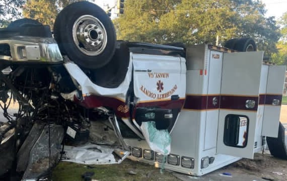 Authorities said the crash happened shortly after 7 a.m. at the intersection of Pine Avenue and Monroe Street, one of the county’s busiest crossings. According to witness reports, the Dougherty County EMS ambulance was traveling through the intersection when the impact from another vehicle caused it to overturn.