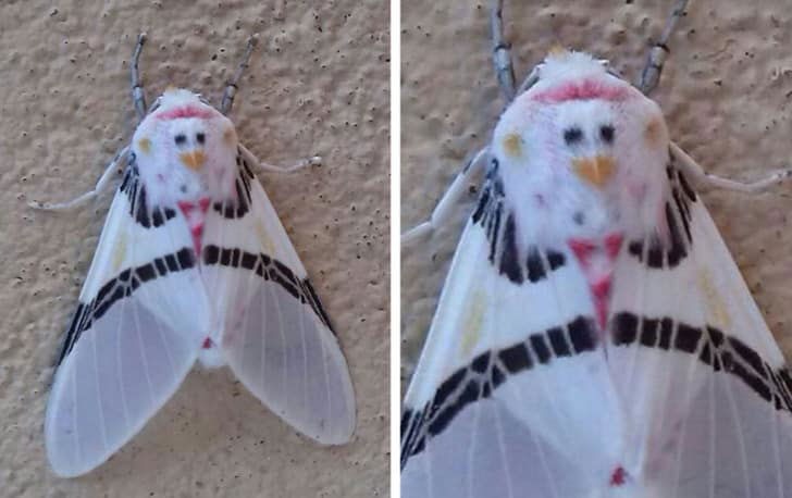 This incredible moth species features markings that resemble a tiny chicken head. With its feathery pattern and bright colors, it looks like nature painted a miniature barnyard animal onto its wings.